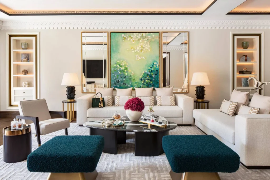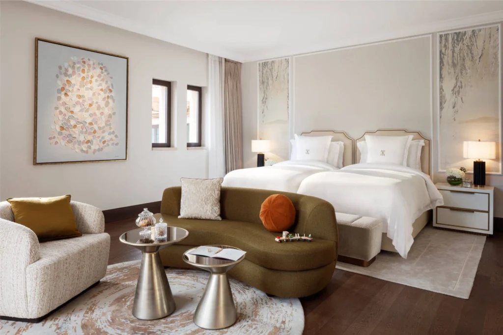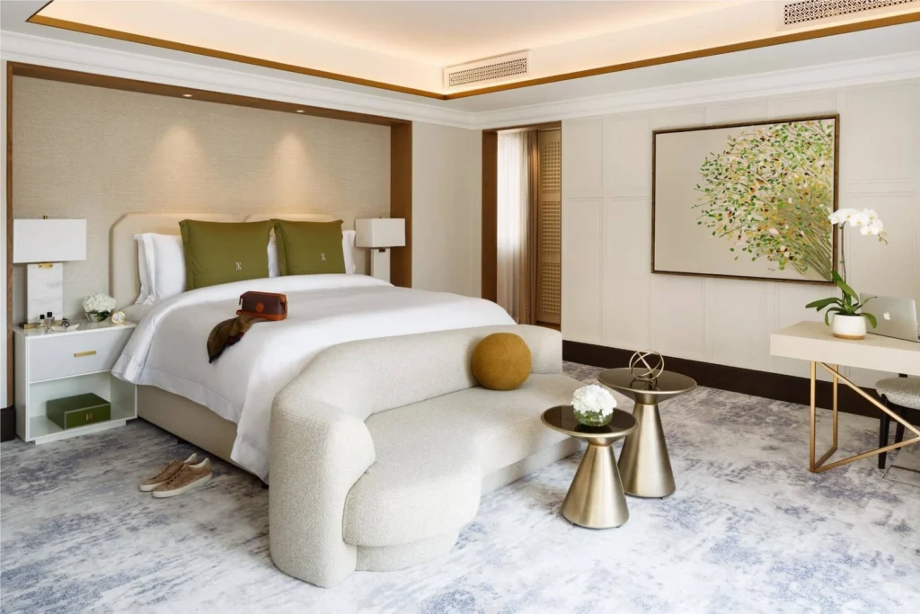 Une suite de 122 m² avec salon, salle à manger et balcon donnant sur les jardins. Un cadre paisible et élégant, avec accès au Palace Lounge pour une expérience exclusive.