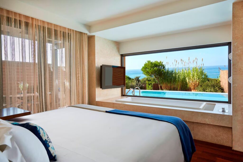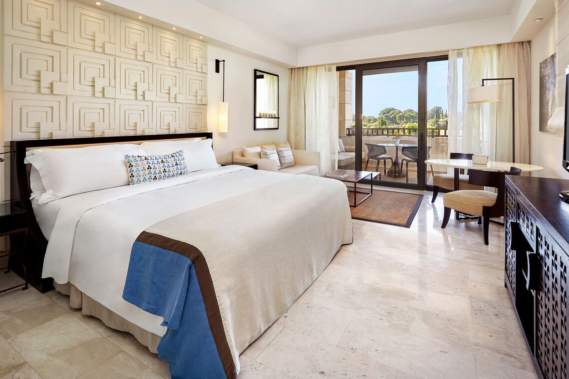- L’hébergement au Romanos Resort Costa Navarino en catégorie Garden View Room